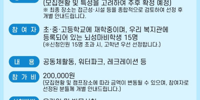 2026 여름방학특별활동교실 참여자 모집 안녕하세요. 서울시립뇌성마비복지관 김한빈 사회복지사입니다. 2026년 여름방학특별활동교실 참여자 모집 안내드립니다. - 모집기간 : 2025.12.15.(월)~2025.12.22.(월) - 운영기간 : 2026.1.12.(월)~2026.1.30.(금) - 신청방법 : 온라인 접수(구글 설문지) 및 방문접수 - 신청링크 : https://forms.gle/AuPZ9GpuU5Qs3yVA7 - 참여자 : 초·중·고등학교에 재학 중인 뇌성마비학생(※우리 복지관에 등록된 분들 한해서 신청 가능합니다.) - 문의 : 함께성장팀 김한빈 사회복지사(02-6926-6924)