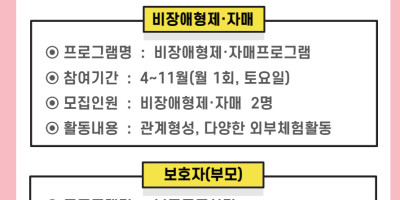 일자 : 2022년 11월 24일(목) 시간 : 오후 2시~4시 장소 : 불암산산림치유센터 대상 : 뇌성마비인의 부모 7명 신청기간 : 11월 11일(금)~11월16일(수) 문의 : 가족심리지원팀 유경민 사회복지사 02-6926-6913 선착순으로 진행되며 이동은 복지관에서 담당자와 동승하여 이동하거나 개별이동으로 진행됩니다. 프로그램 내용이나 그외 궁금한 점은 담당자에게 문의 바랍니다.