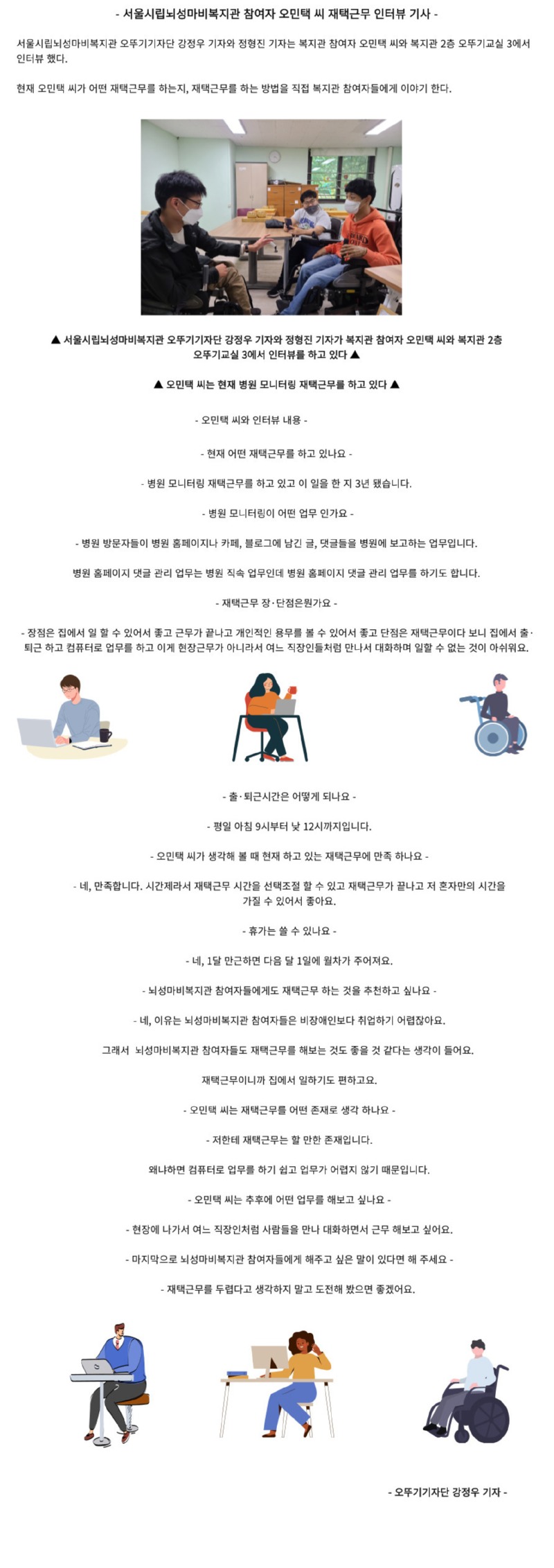 서울시립뇌성마비복지관 참여자 오민택 씨 재택근무 인터뷰 기사
