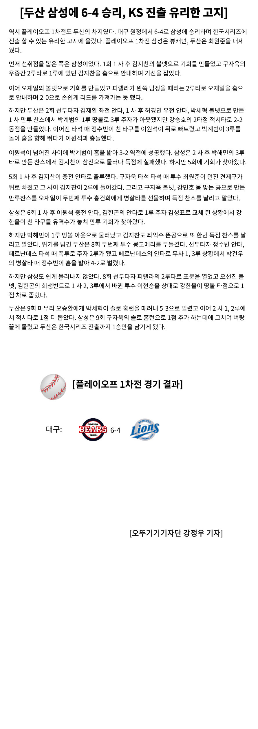 [두산 삼성에 6-4 승리, KS 진출 유리한 고지]