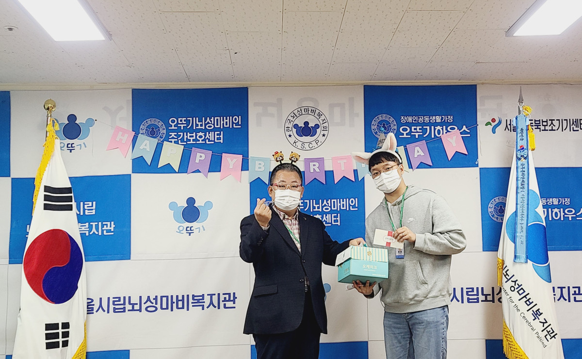 우리 복지관 2층 회의실에 몇몇 사람들이 모여 가족지원팀 정의현 주임의 생일파티를 하였습니다.
